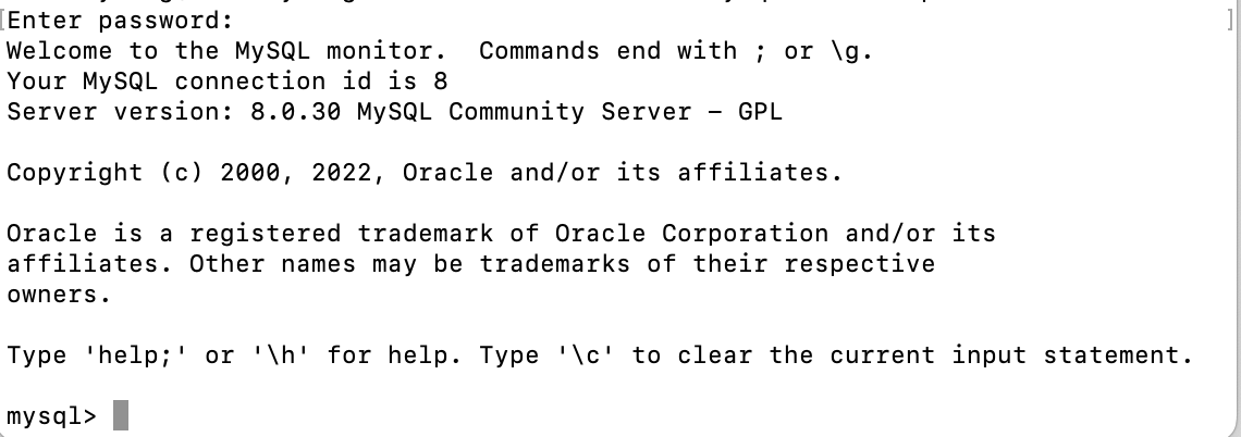 명령어를 치면 password를 입력하라고 뜨는데, 이때 설치하면서 설정했던 root 계정의 비밀번호를 입력해주세요.